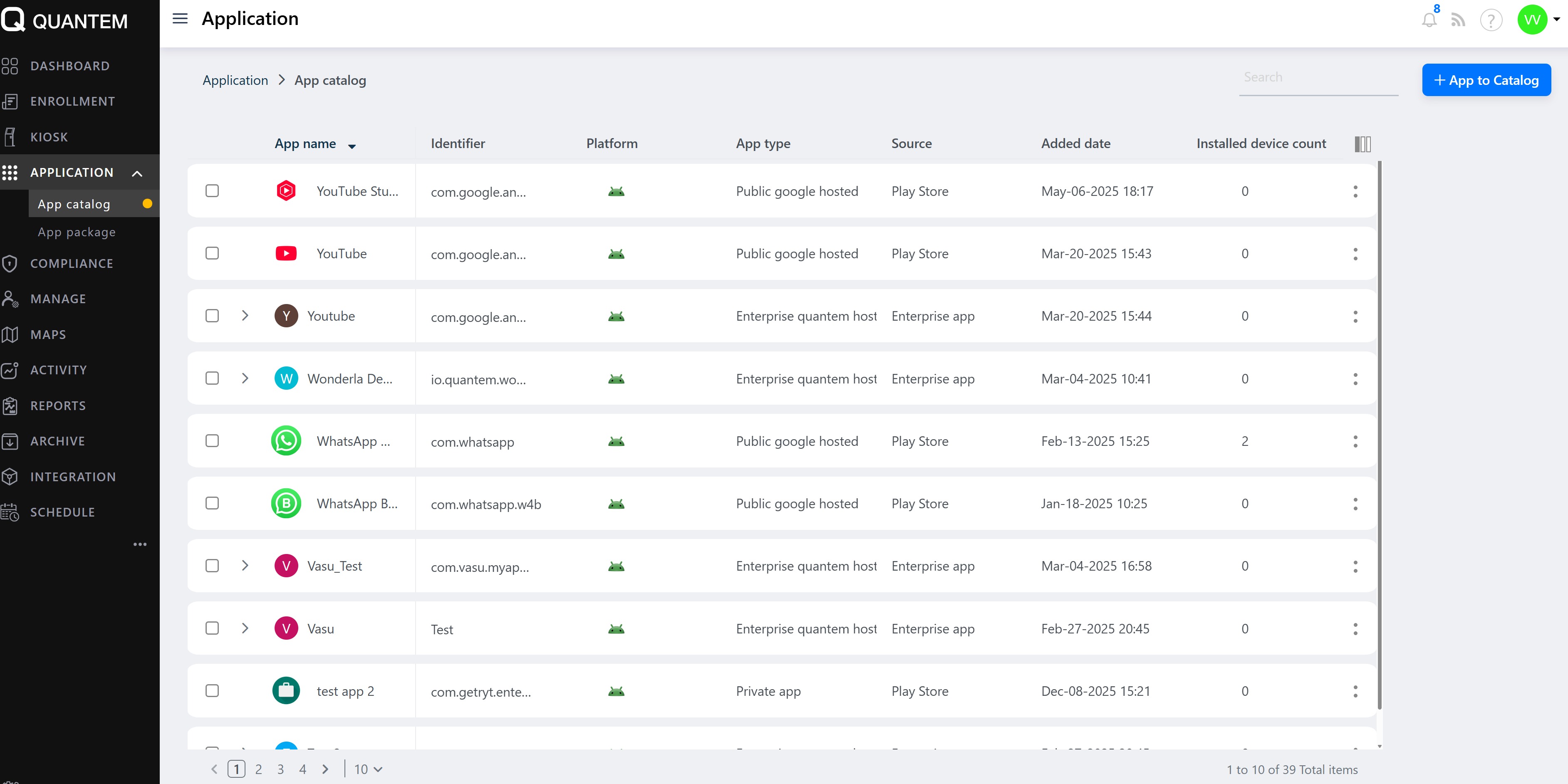 The App Catalog module in the admin console lets you manage applications that can be deployed to devices. You can add apps from Google Play Store, upload enterprise apps, view app details, assign apps to devices or groups, manage app versions, and delete apps.