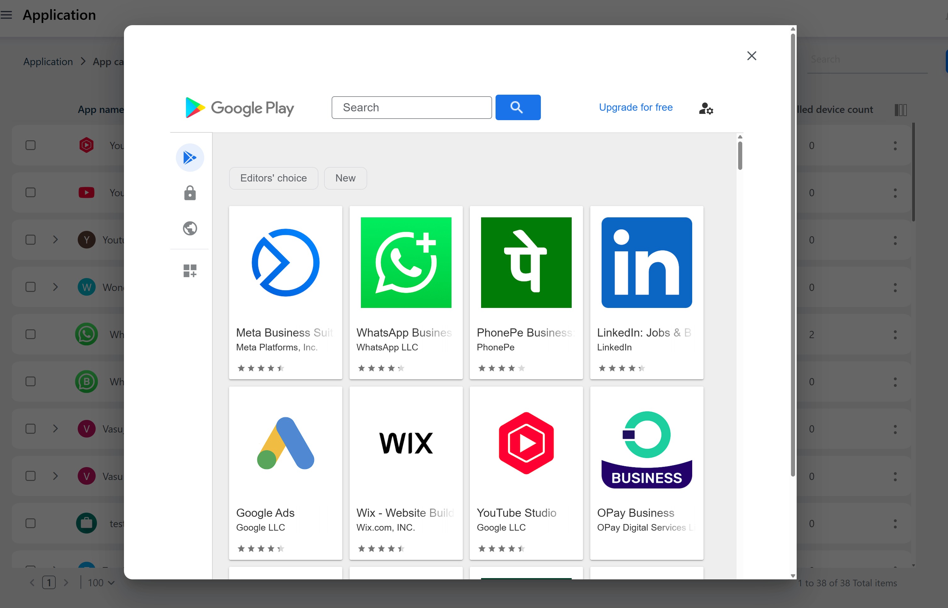 A list of available apps is displayed in table format with columns showing app name, identifier, platform, app type, source, added date, and installed device count.