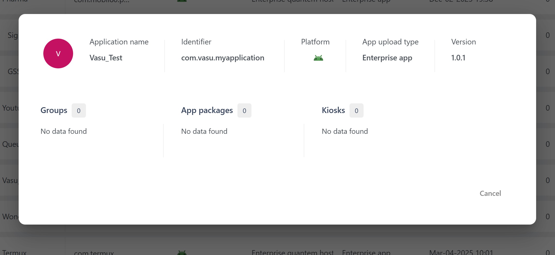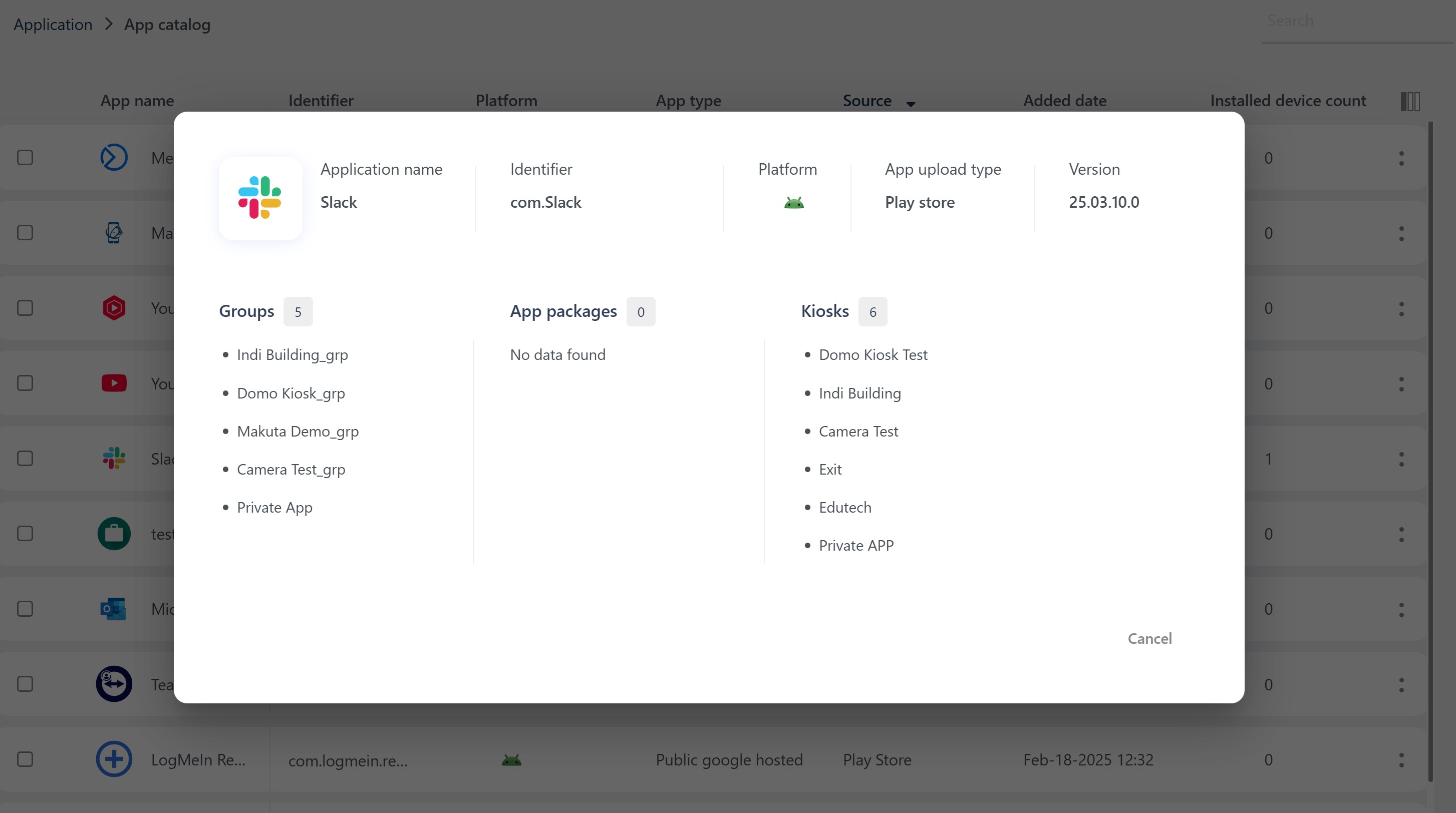 Count and list of groups, packages, and kiosks to which the app is assigned.