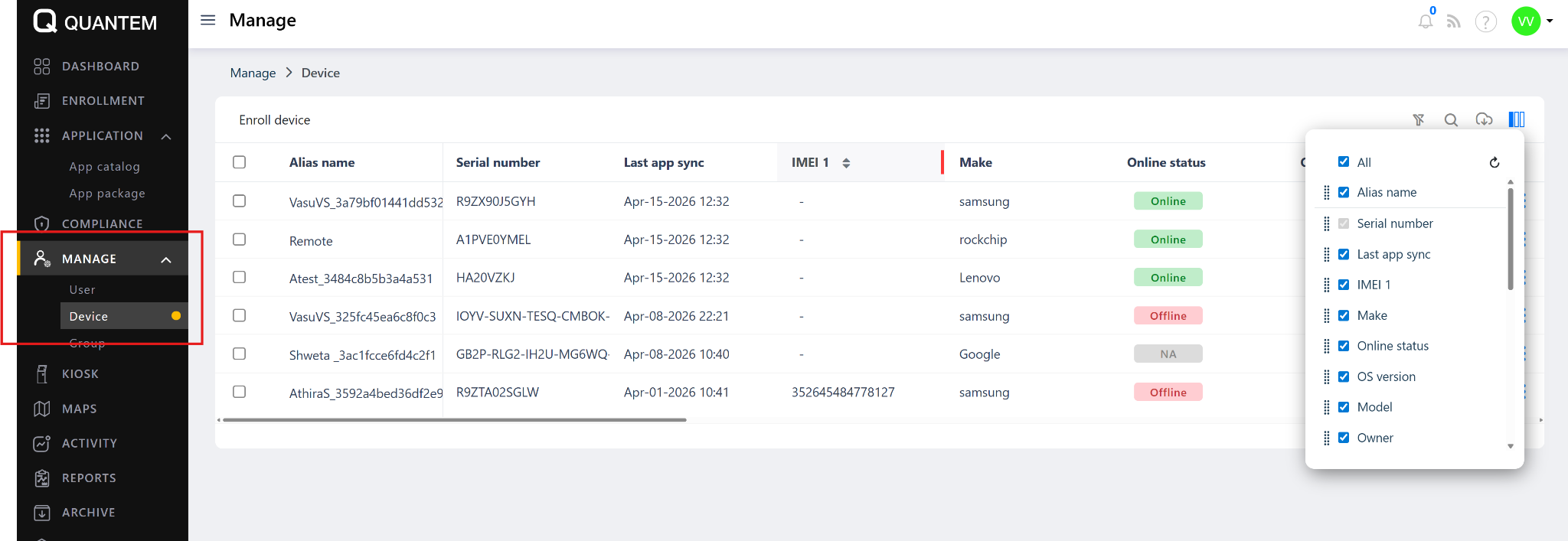 The Device section under Manage lists all enrolled devices in your organization, allowing admins to monitor device status and view key device information from a single view.