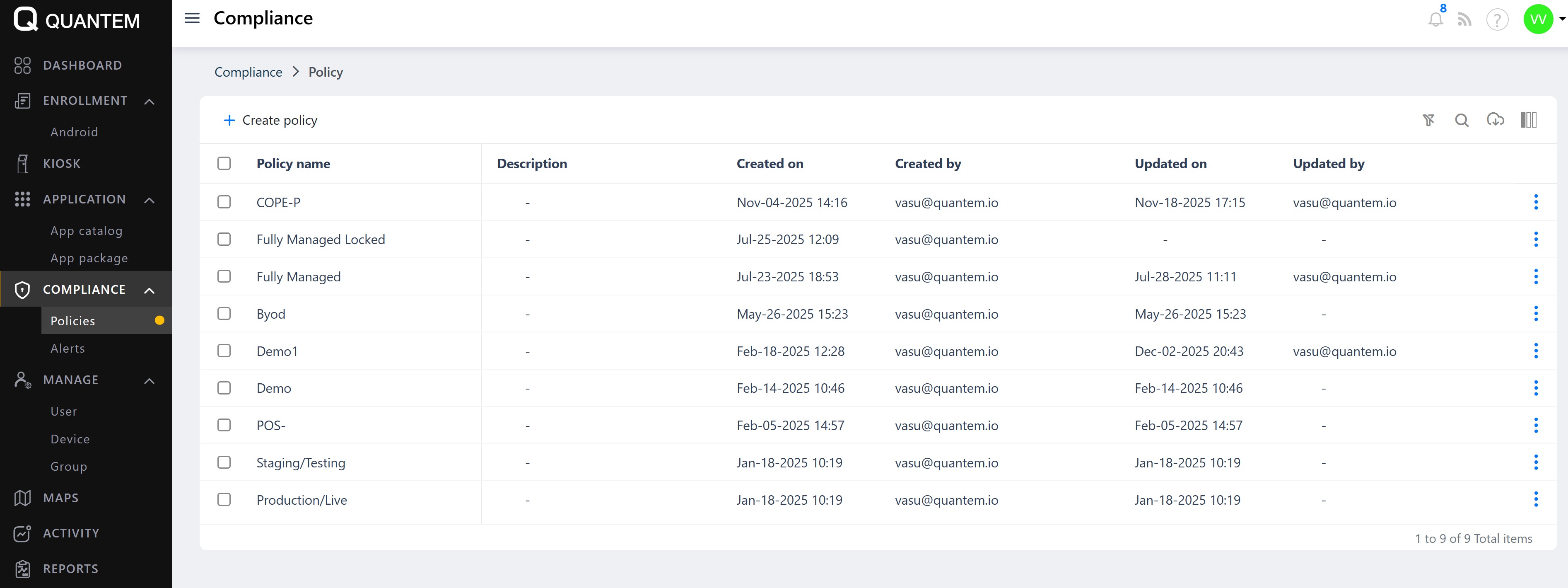 The Policy module in the admin console lets you create, configure, and manage device policies. Policies are sets of rules and settings that control device behavior and app permissions across managed devices and groups.