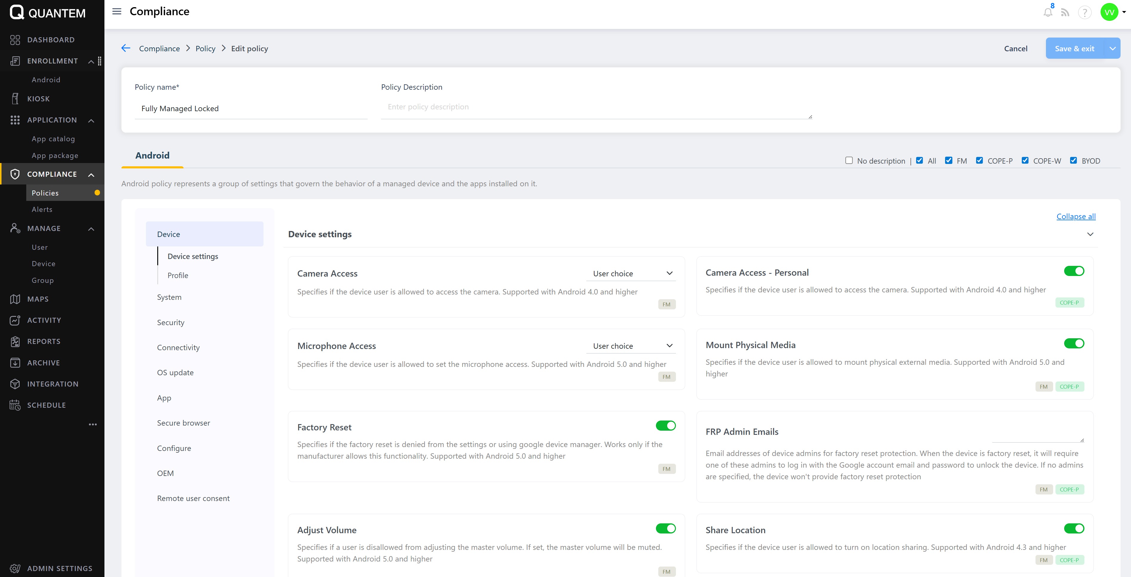 Configure the desired Android policies by toggling settings on/off or selecting values from dropdowns.