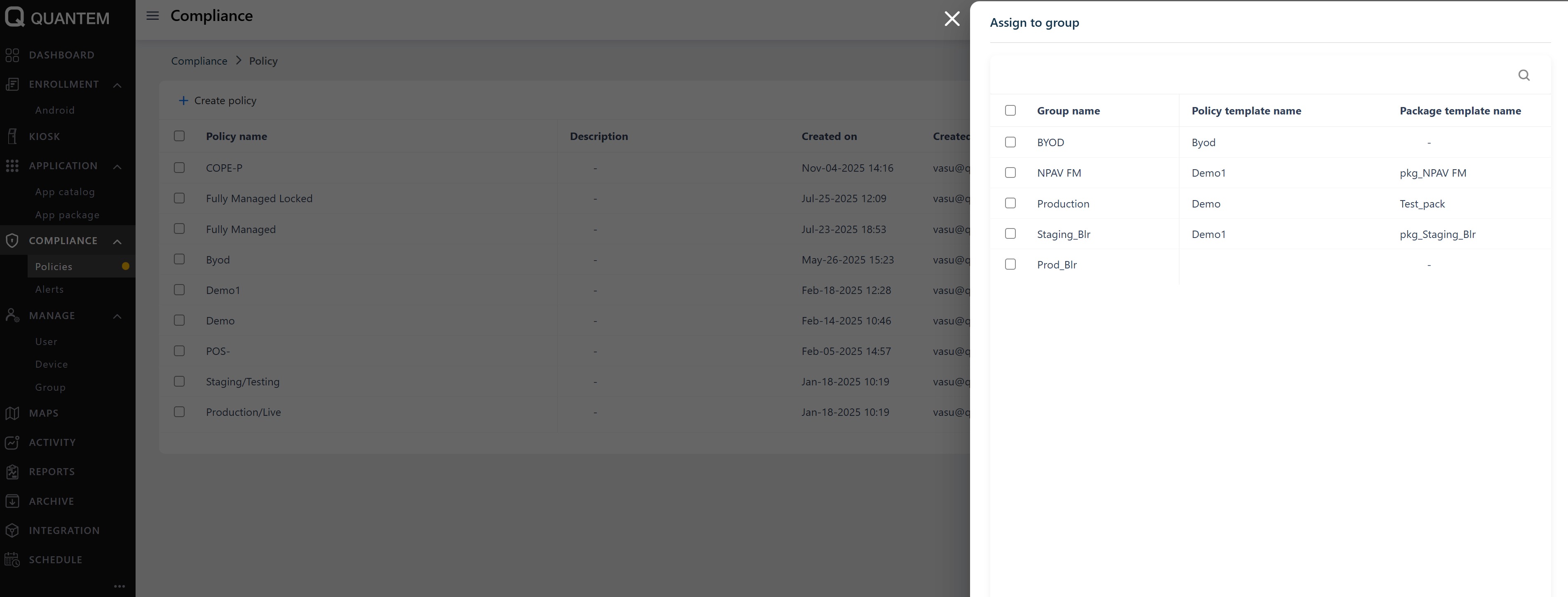 Select one or more groups and click Assign to apply the policy to those groups with a confirmation message.