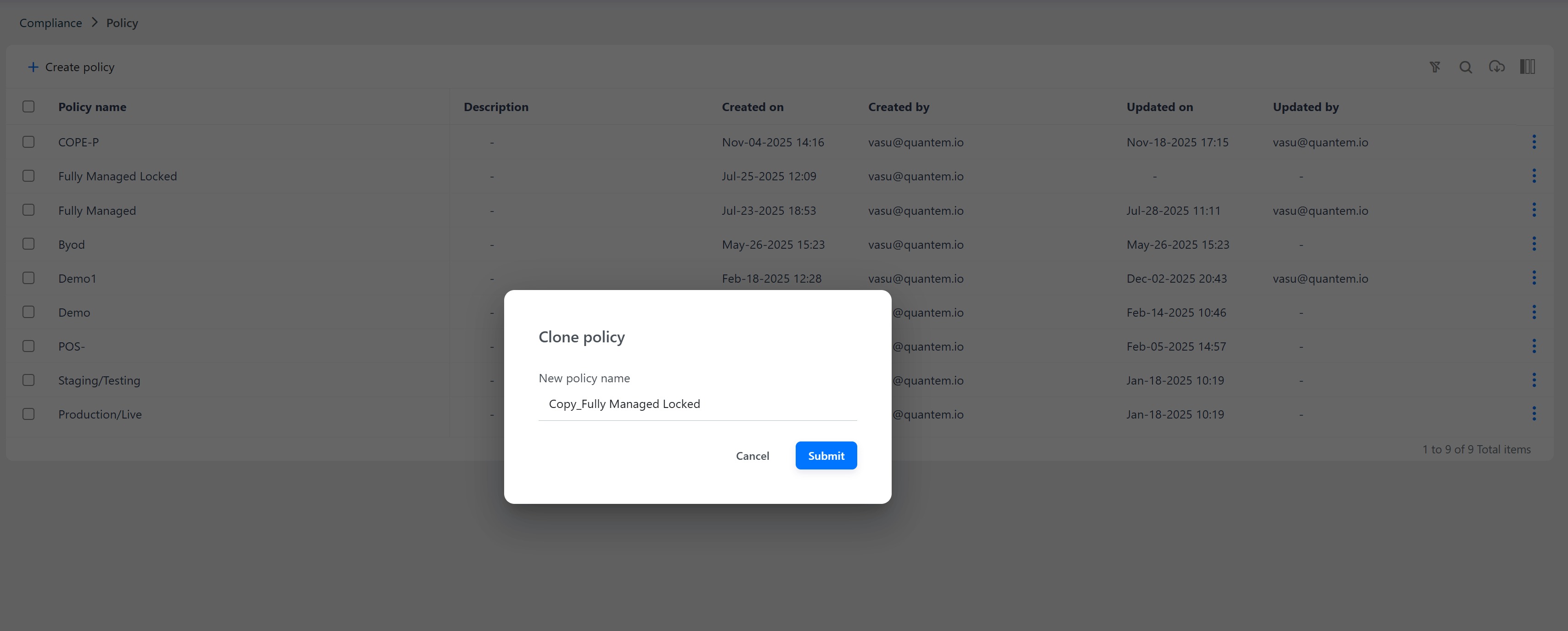 Enter a new policy name and click Submit to create a duplicate of the policy with the new name.