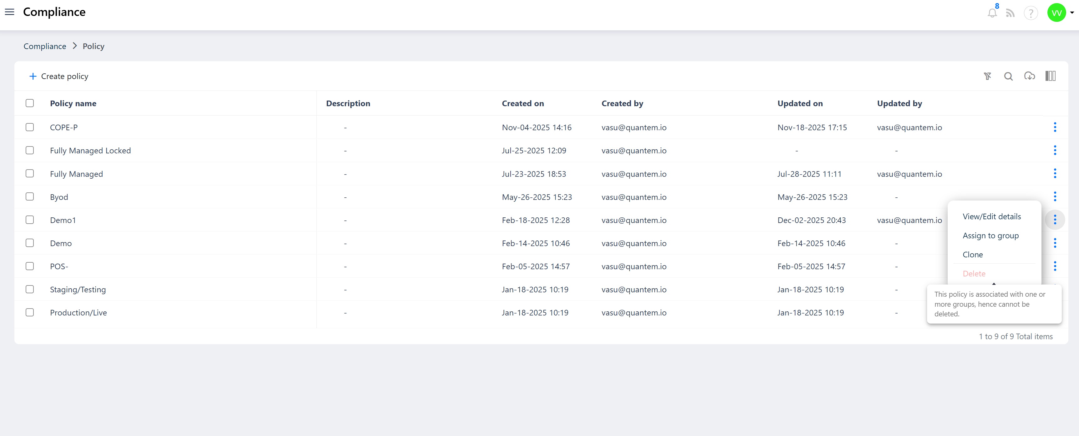 Note: A policy can only be deleted if it is not assigned to any group. If a policy is assigned to groups, the Delete option will be unavailable and display a tooltip explaining that the policy cannot be deleted while in use.