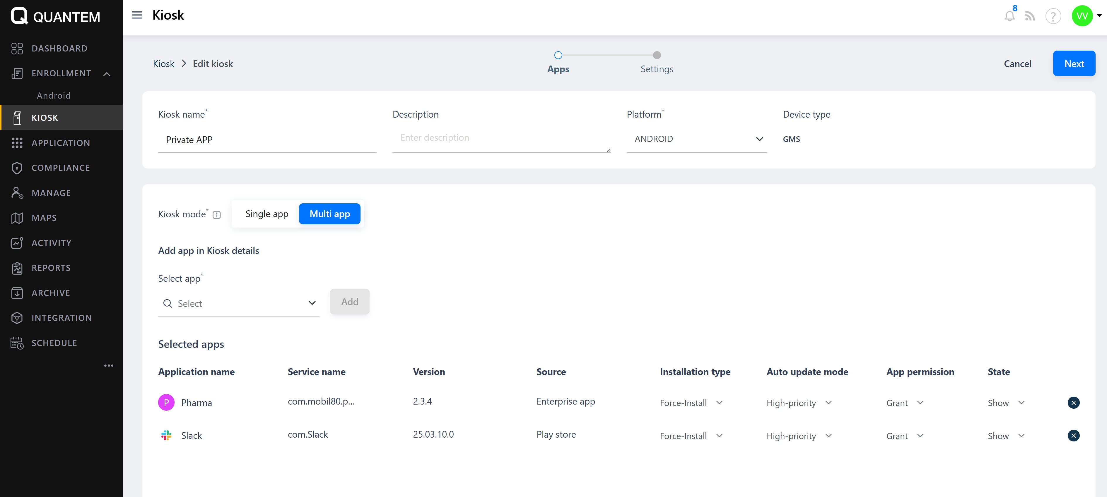 The kiosk details screen opens, showing the current apps and settings.