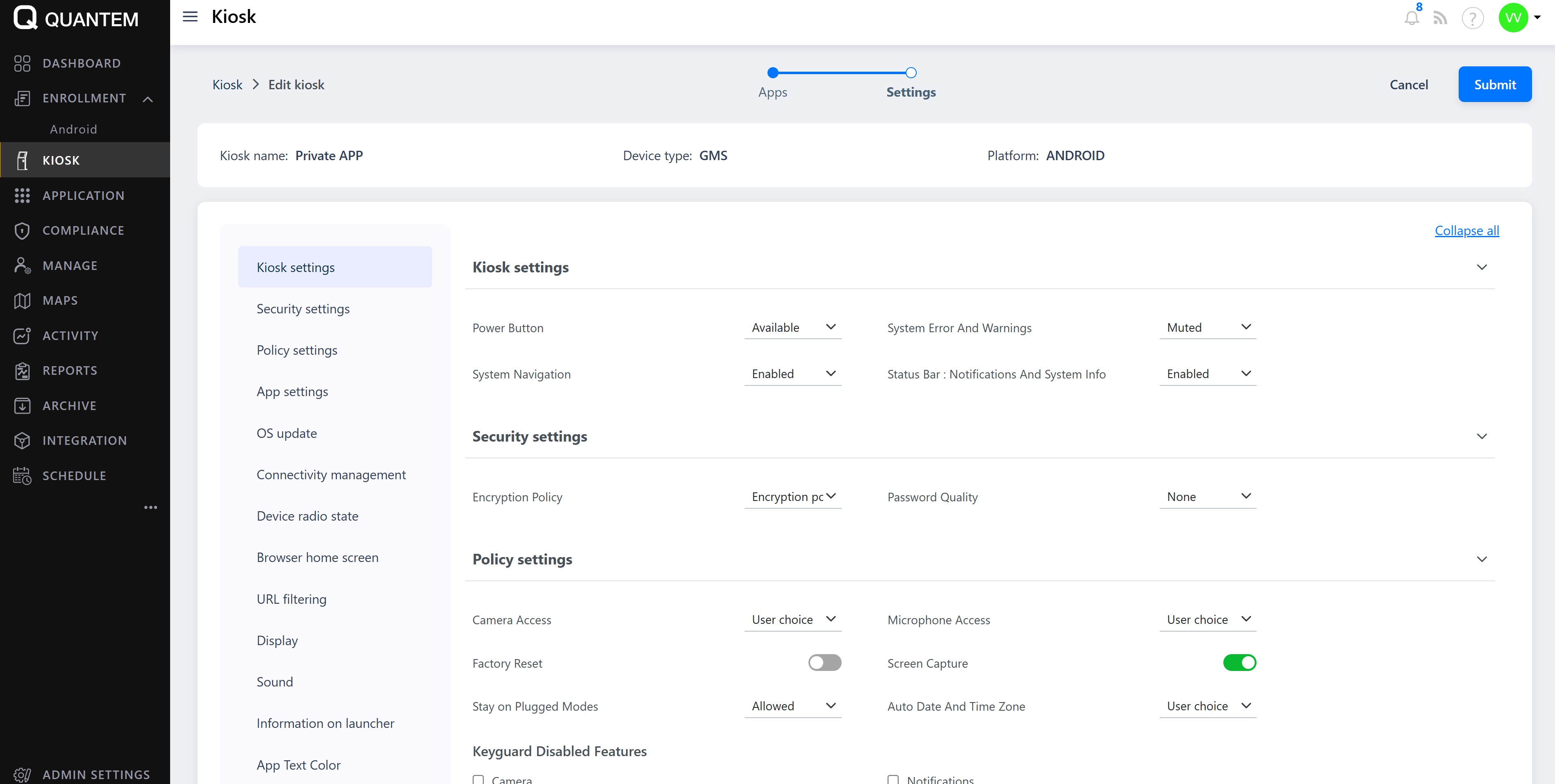 Kiosk settings – Power button behavior, system navigation, error warnings, status bar, app settings, OS updates