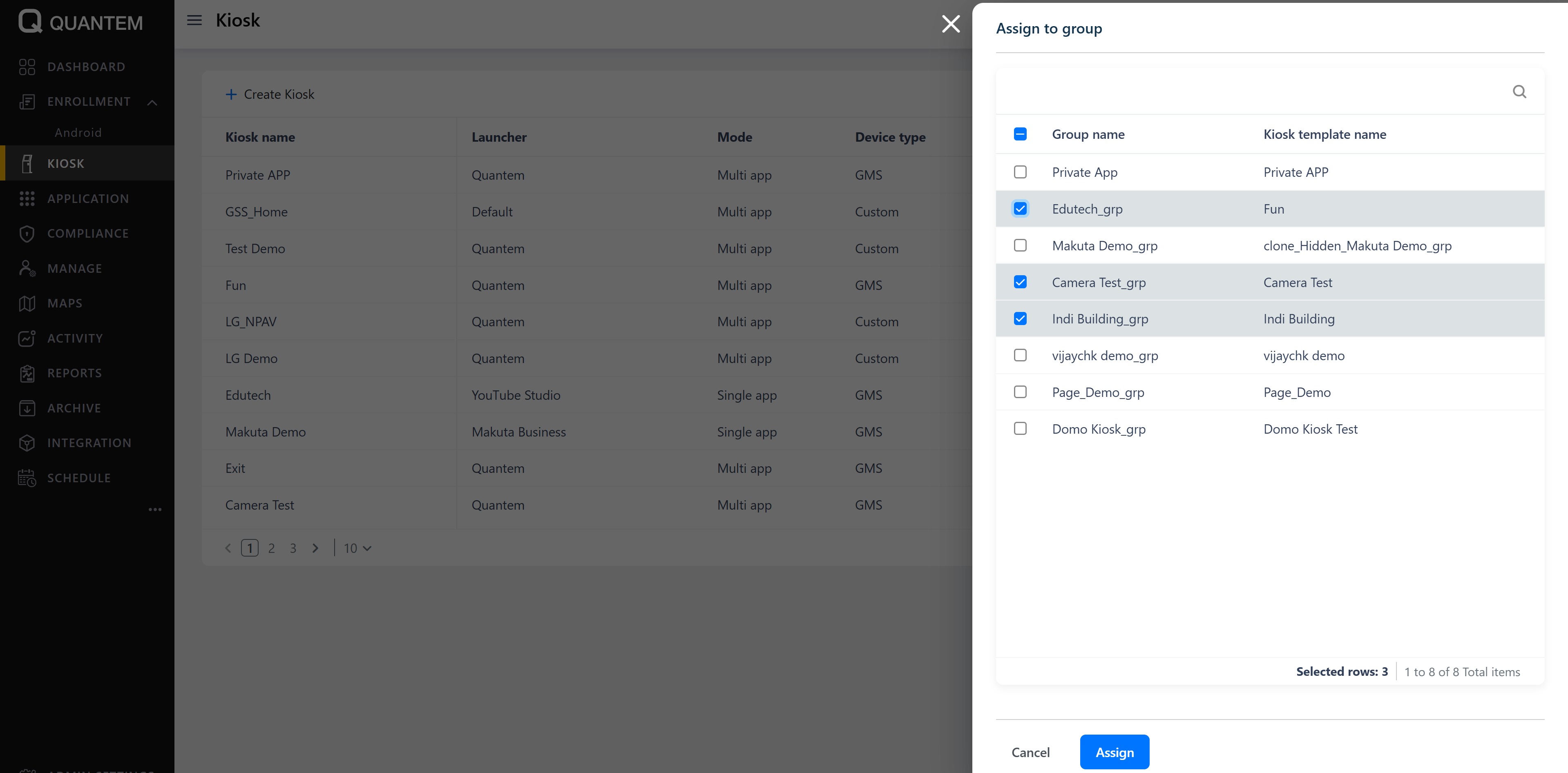 Click Assign to apply the kiosk to the selected groups with a confirmation message.