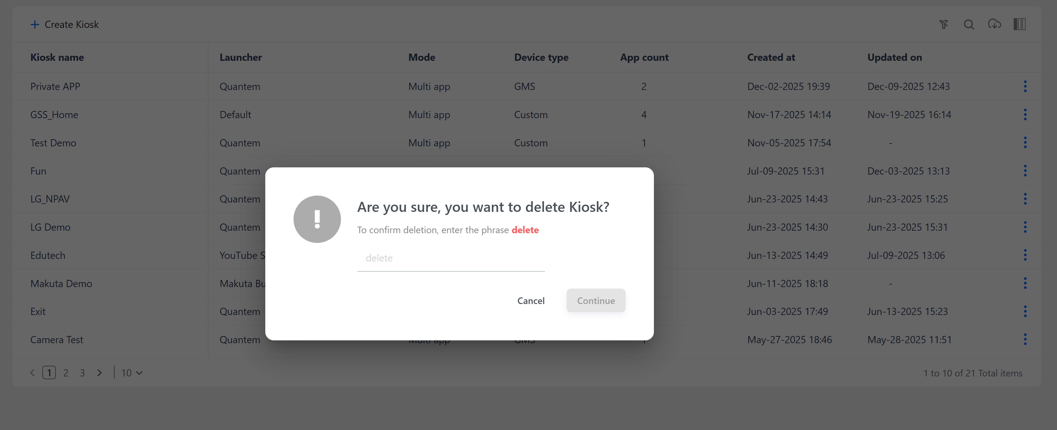 A confirmation dialog appears asking "Are you sure you want to delete Kiosk?"