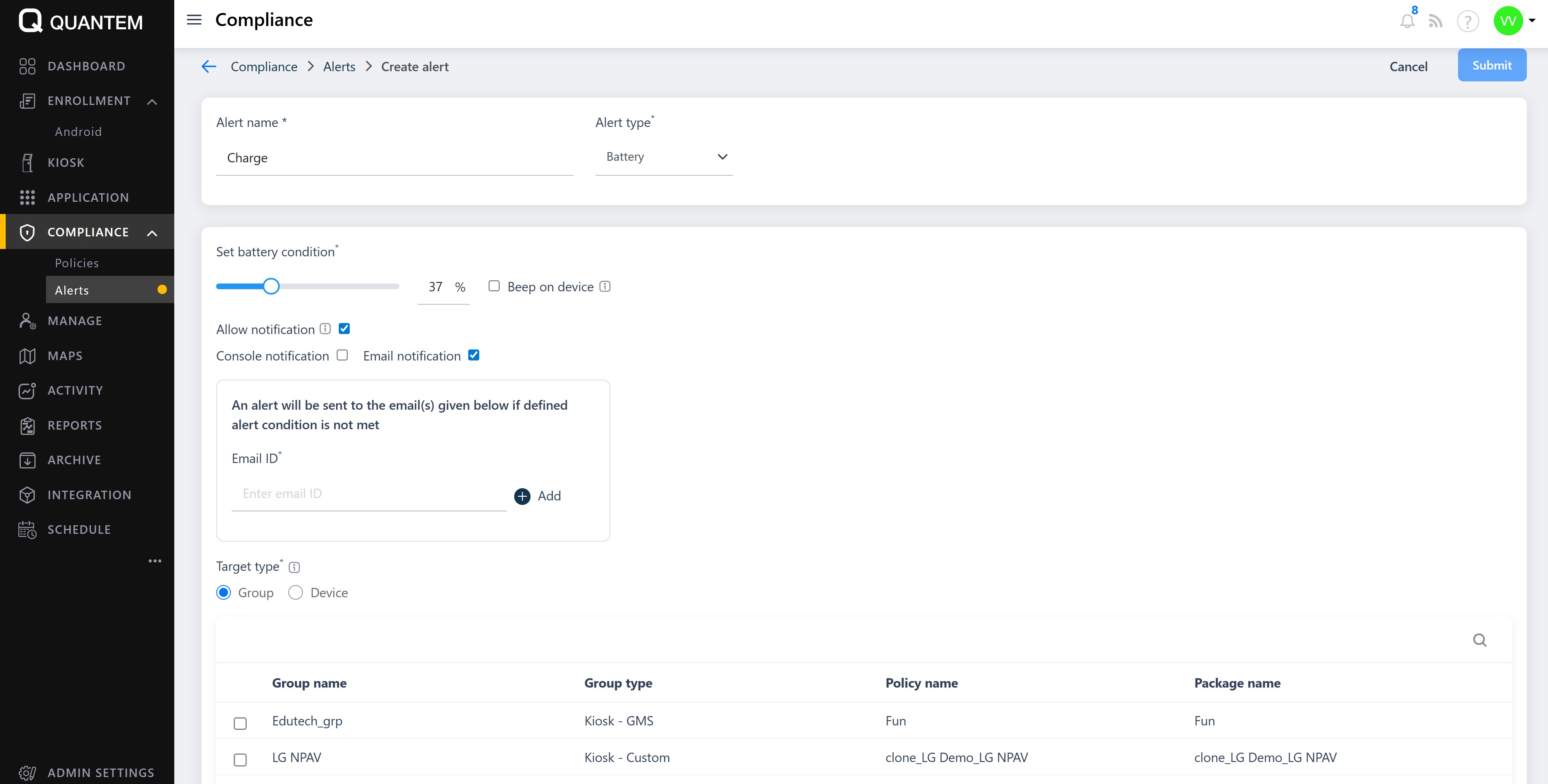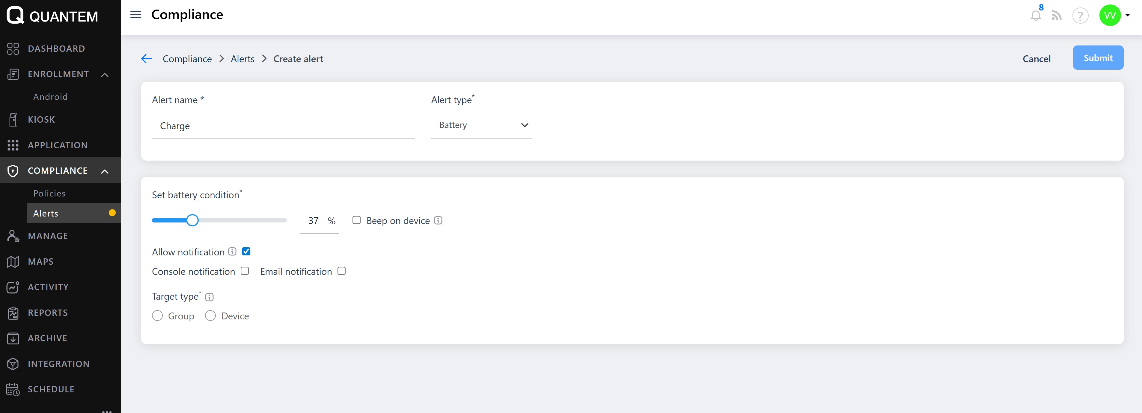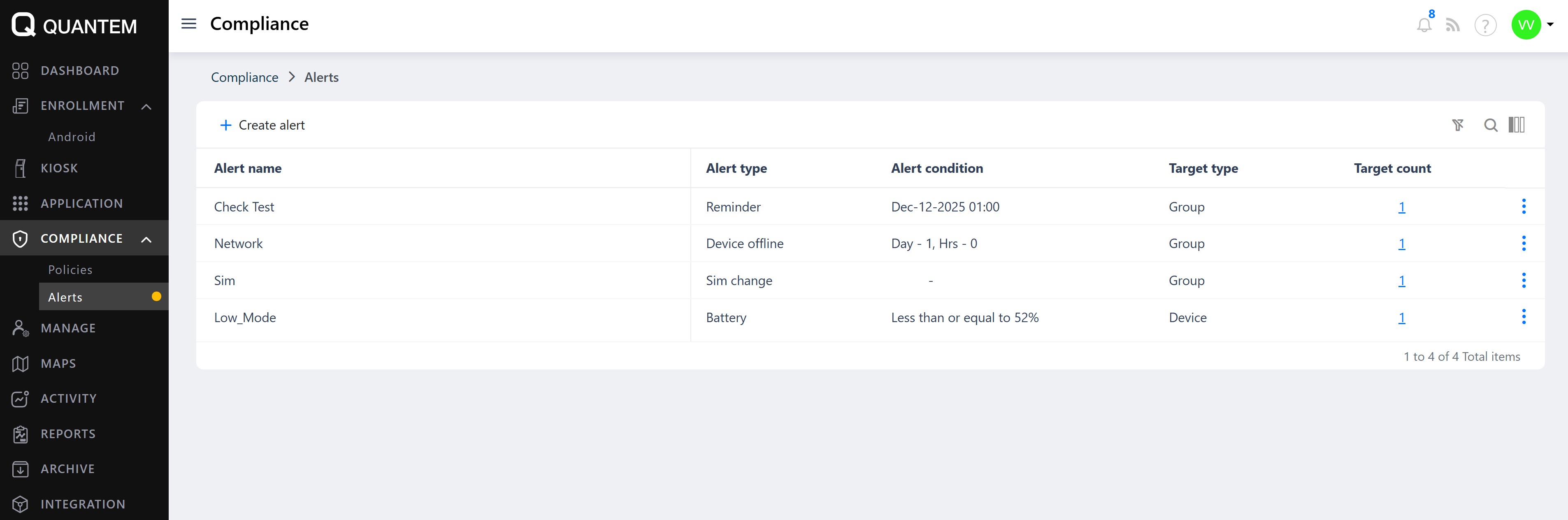 The Alerts module in the admin console lets you create and manage automated alerts based on device conditions. You can set up alerts for battery levels, device offline status, SIM card changes, and scheduled reminders, with notifications sent to the console, email, or both.