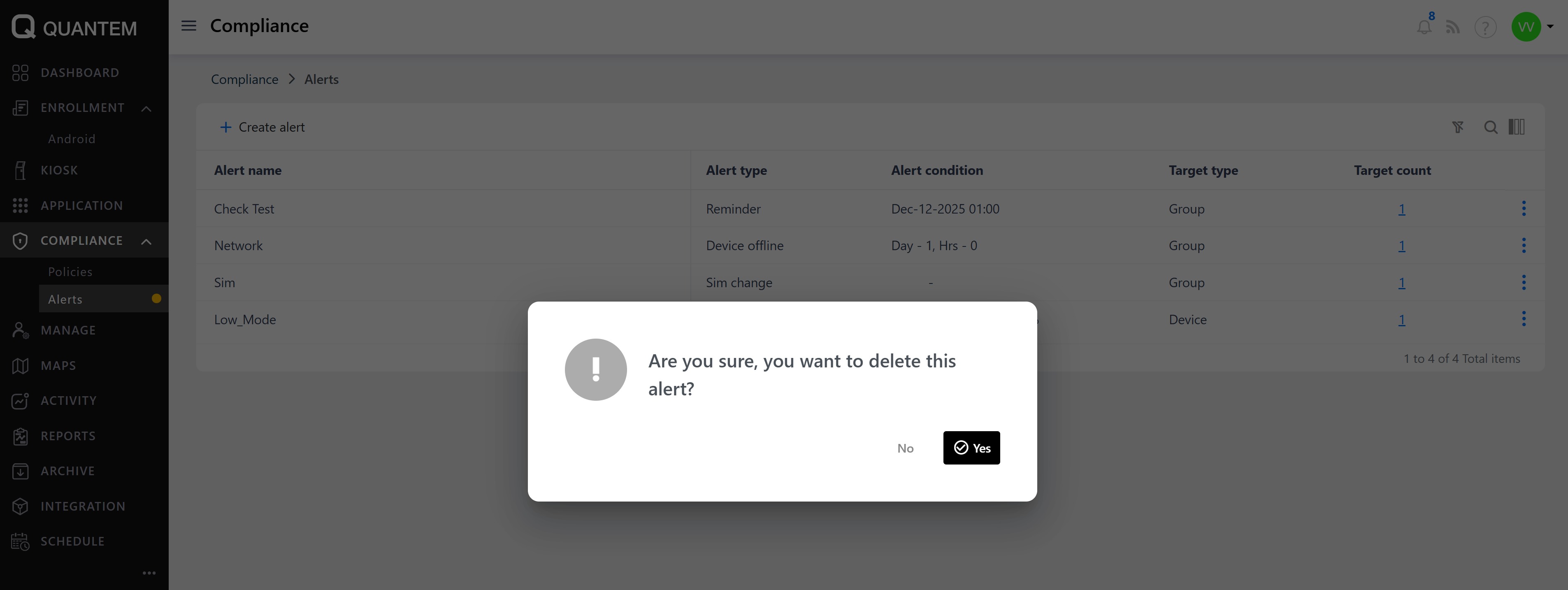 A confirmation dialog appears asking "Are you sure you want to delete this alert?"