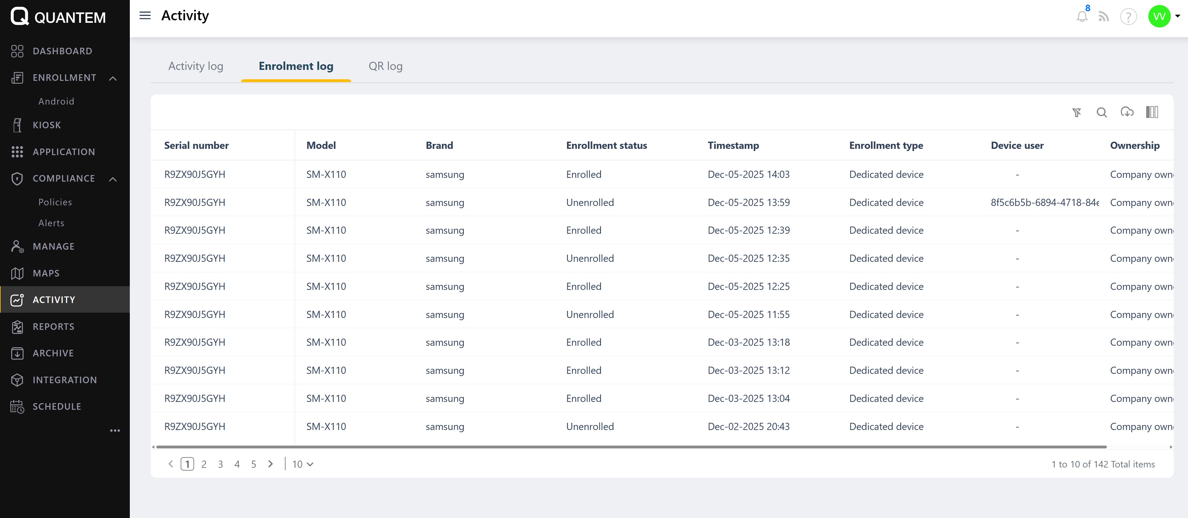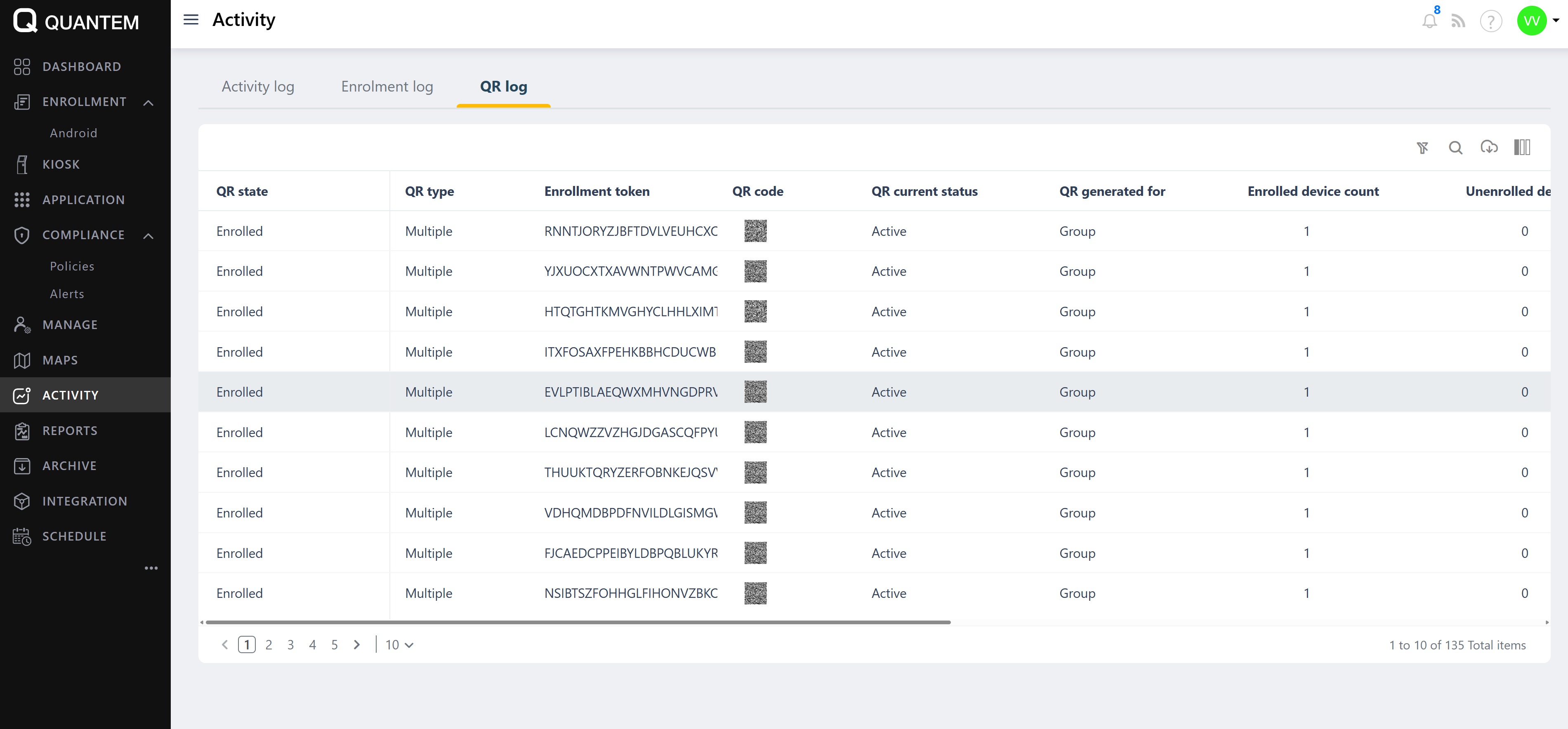 QR logs record all QR codes generated in the admin console for device enrollment.