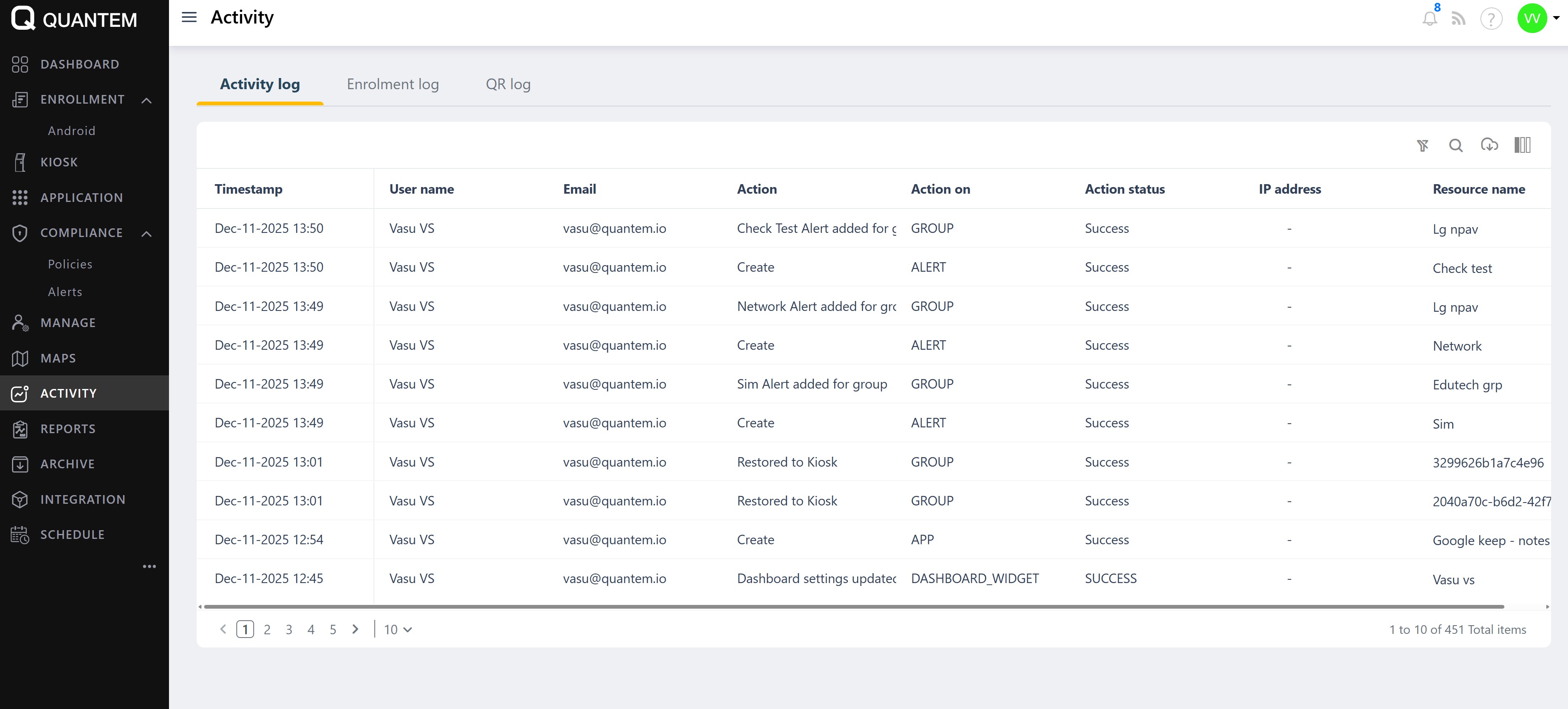 The Activity Logs module in the admin console tracks and stores logs for all activities performed in the system. You can view and download three types of logs: enrollment logs, activity logs, and QR logs.