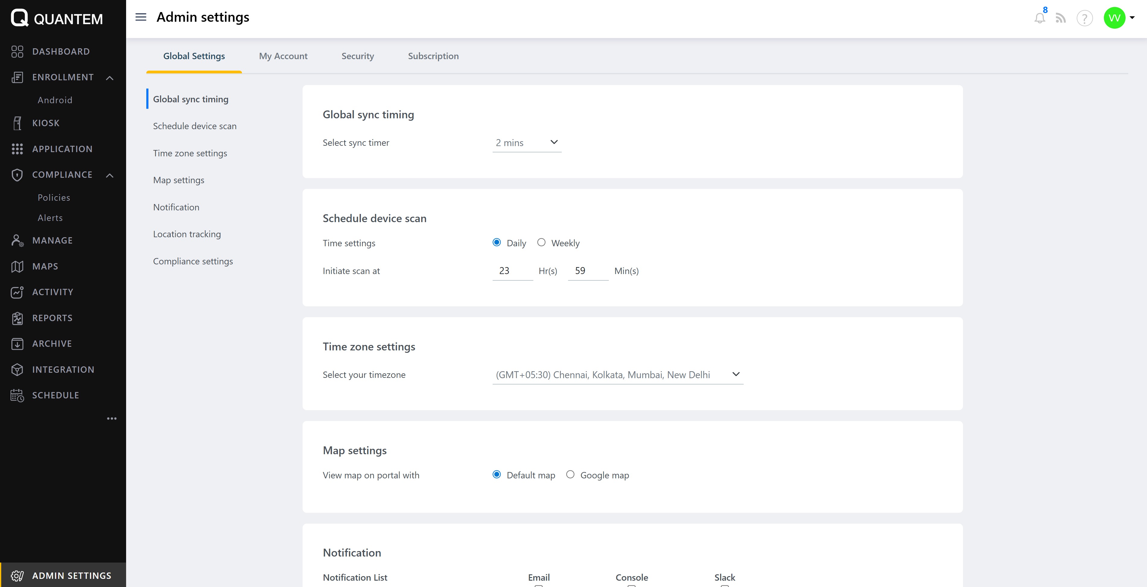 The Admin Settings module provides system-wide configuration options for managing device scanning, maps, time zones, notifications, location tracking, and compliance rules. These settings control how the platform operates and how administrators receive important updates.