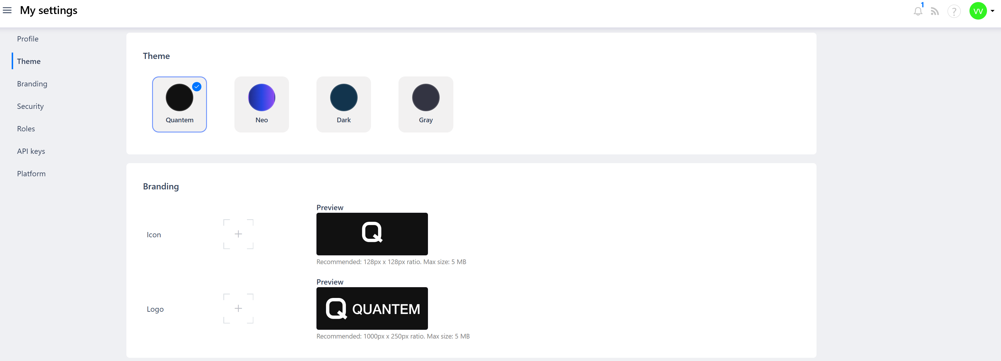 This article explains how to change the console theme and configure branding (favicon and company logo) in the Quantem admin console.