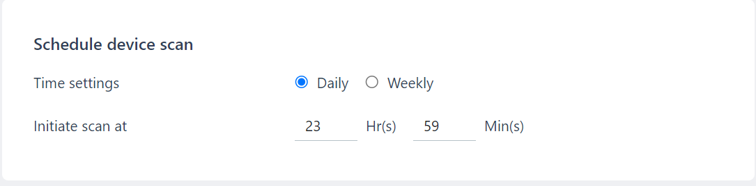 Set the specific hour and minute when the scan should occur (e.g., 23:59).