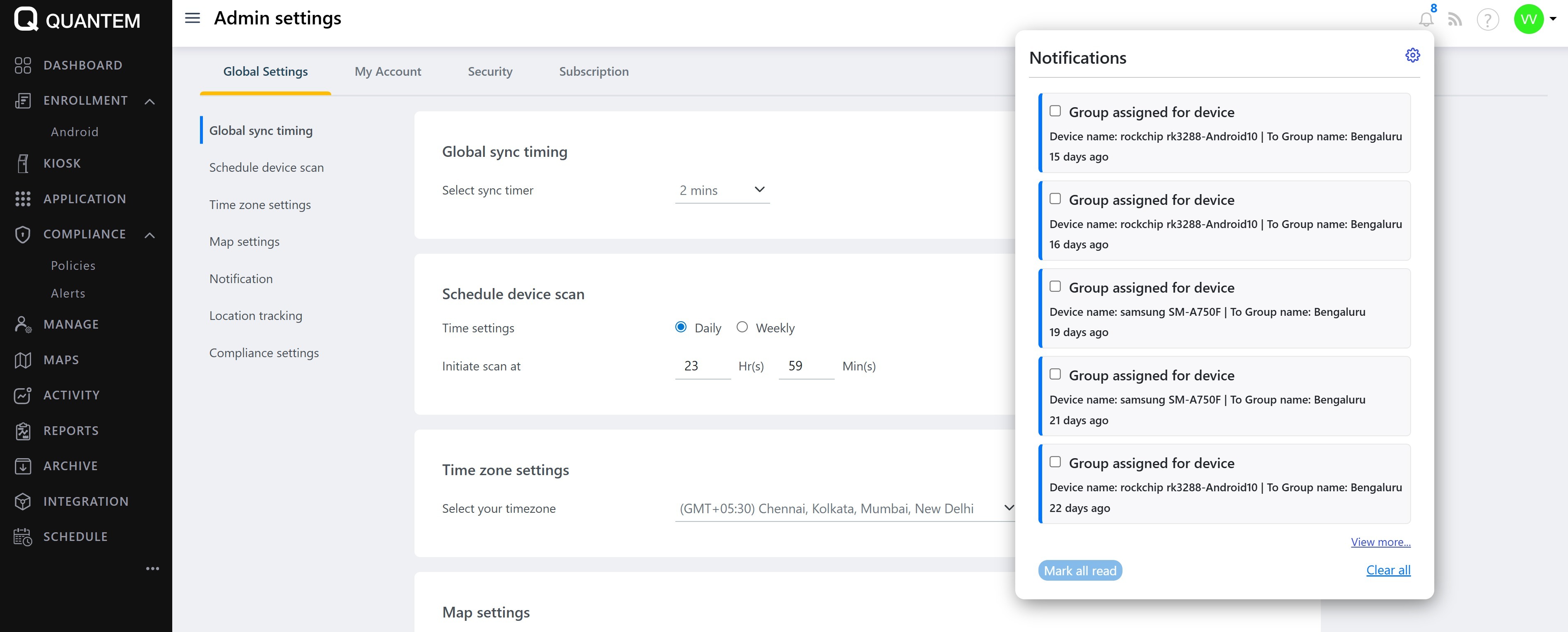 The Admin Settings module provides system-wide configuration options for managing device scanning, maps, time zones, notifications, location tracking, and compliance rules. These settings control how the platform operates and how administrators receive important updates.