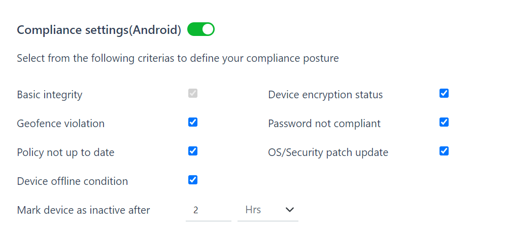 Administrators can select which compliance criteria to enforce. Compliance settings are applicable to Android devices only.