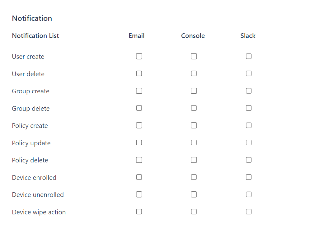 Administrators can select one or more notification channels and one or more events to monitor.