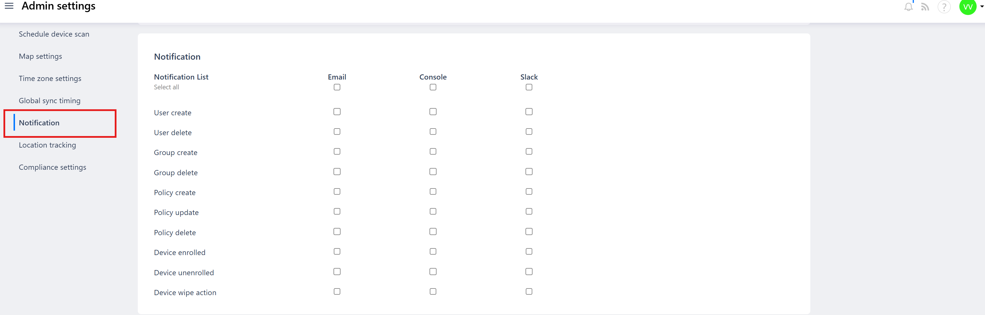 Under Admin Settings, click on Notifications to open the Notification List page.