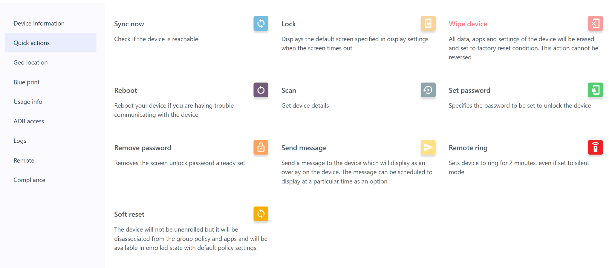 The Quick Actions section allows admins to perform remote actions on an individually selected enrolled device directly from the Quantem Console — without physical access to the device.