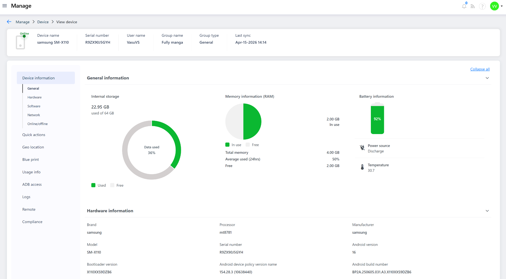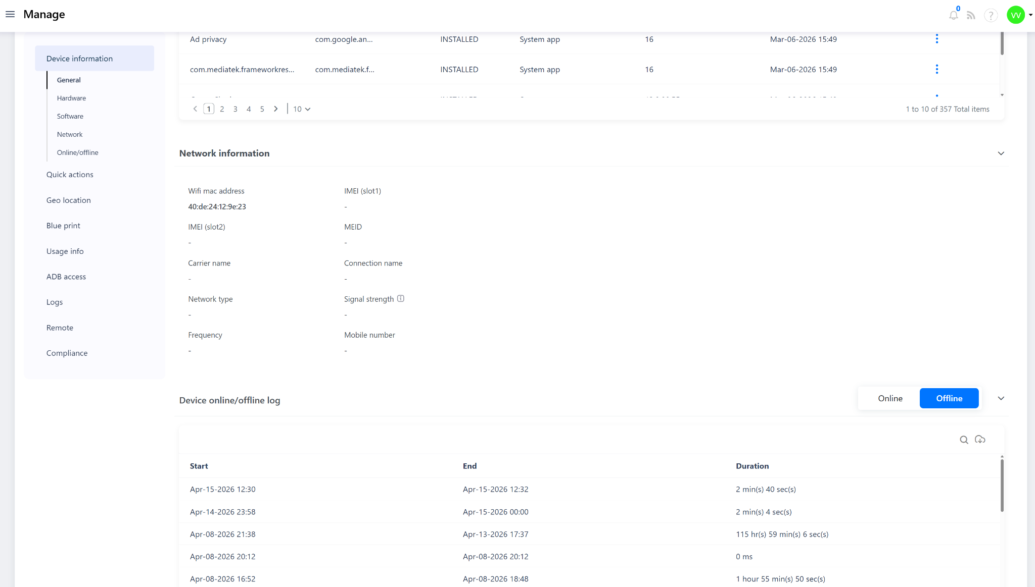 The Device Information section provides a comprehensive view of a selected device's telemetry data — including hardware specs, storage, memory, battery, installed apps, network details, and online/offline history — all from within the Quantem Console.