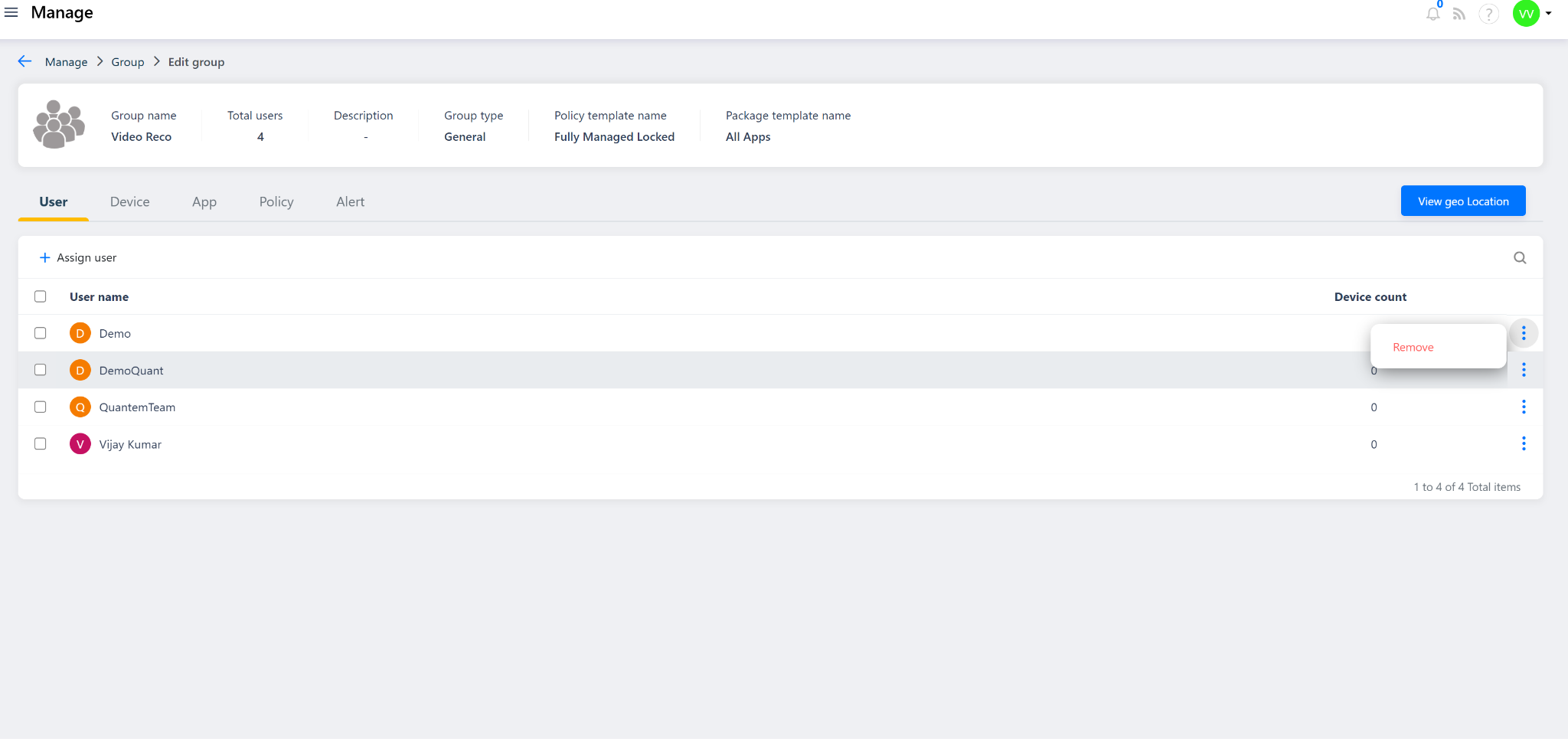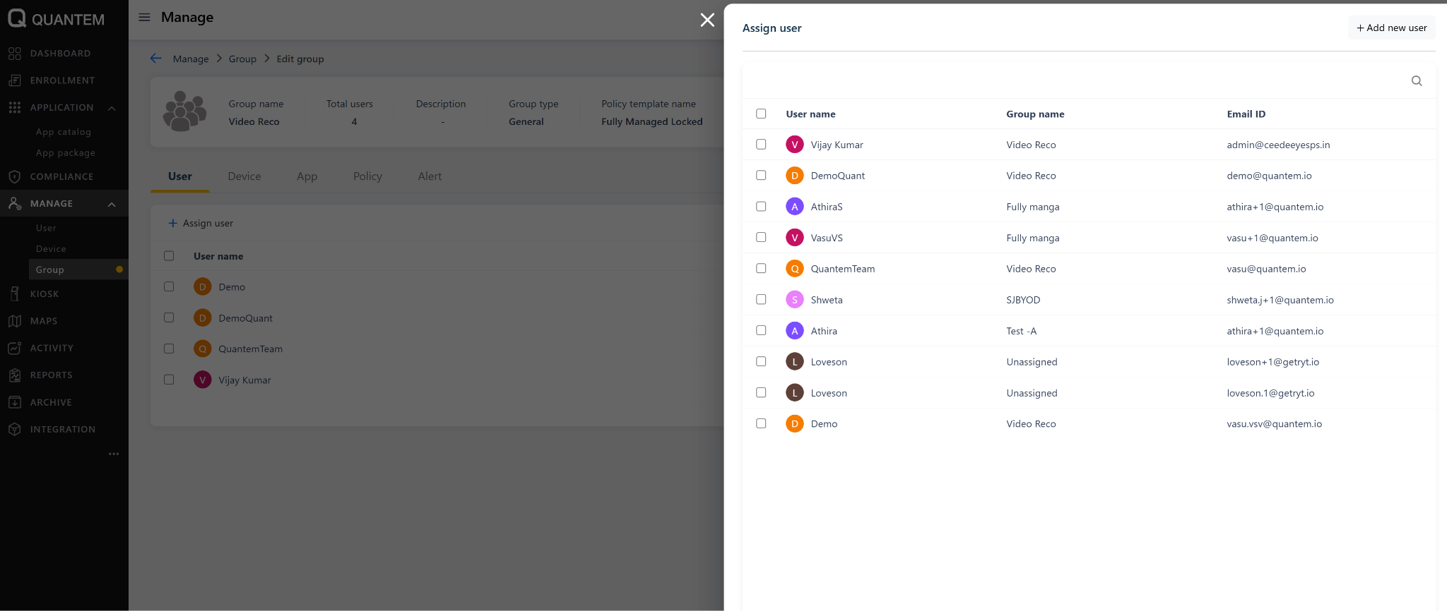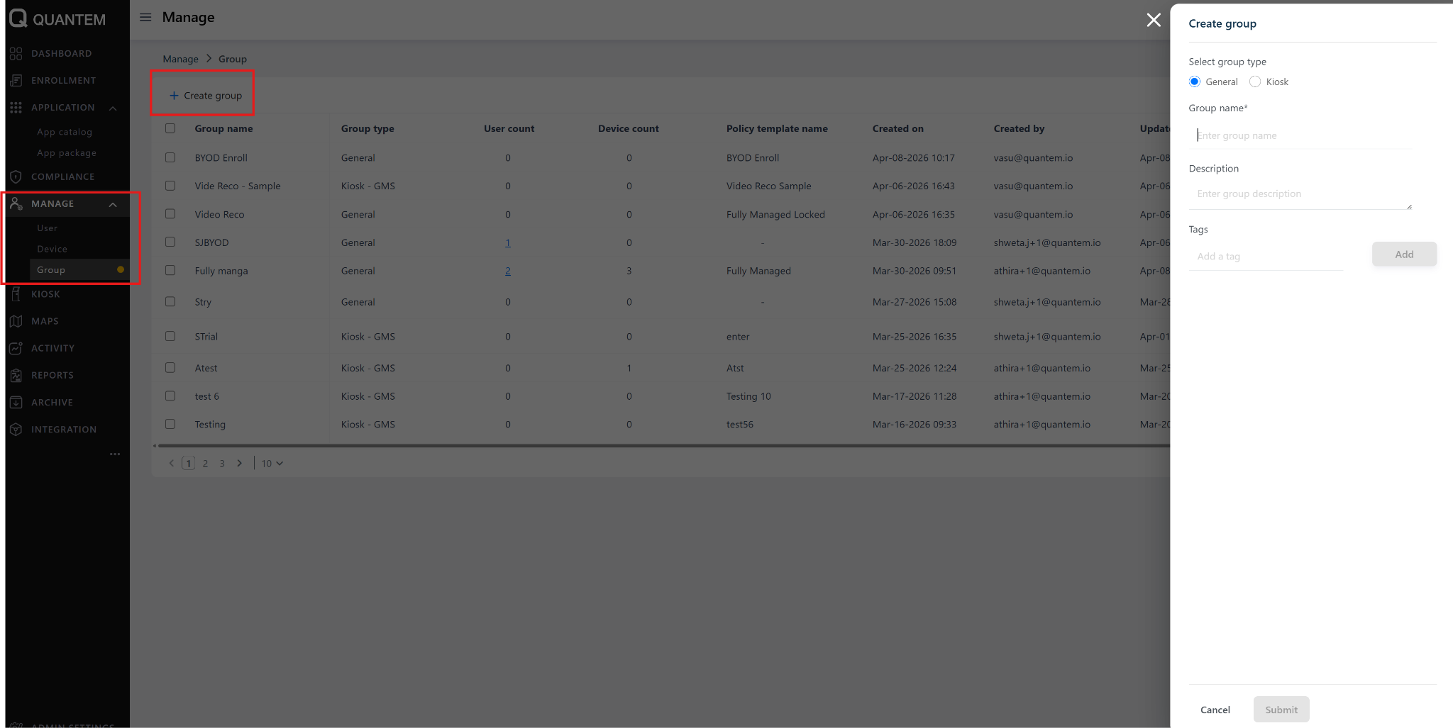The Group module in the Quantem Console allows admins to organize devices and users into groups for easier policy and app management. This article covers all group-related functionalities including creating, editing, viewing, and deleting groups, as well as managing users, policies, and apps within a group.