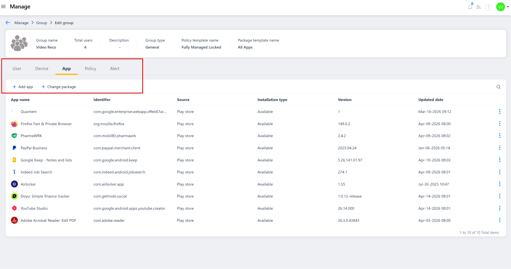 Top section – Group name, Total users, Description, Group type, Policy name, Package name