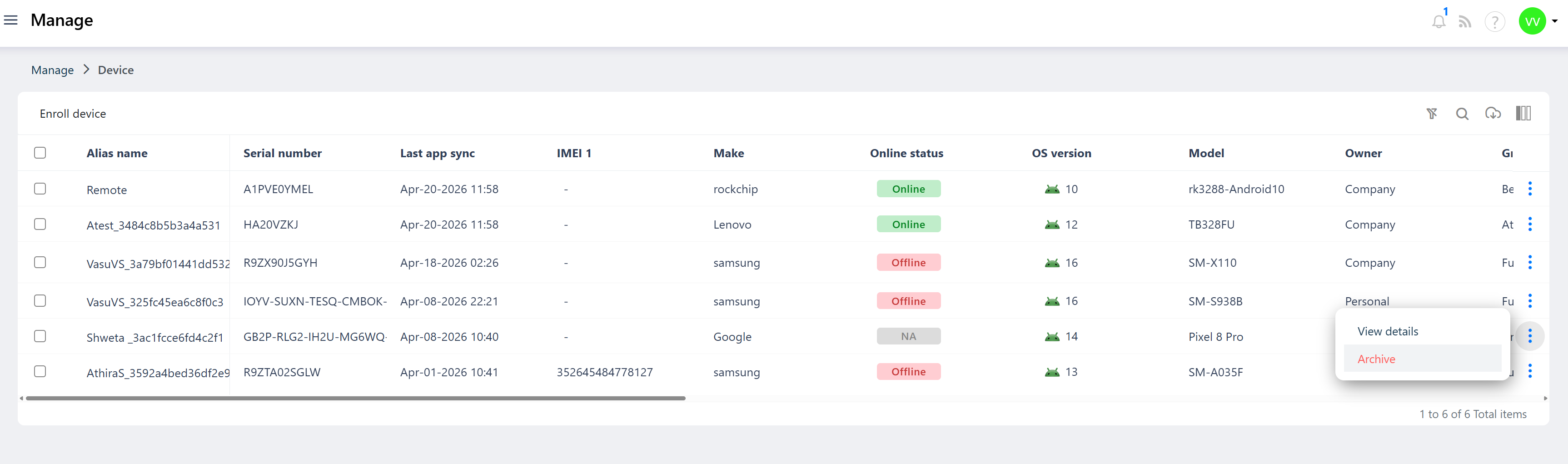 The Archive serves as a historical repository of all decommissioned devices. Admins can still view the device's past details, enrollment history, and activity from the Archive even after the device has been wiped. Additionally, if the same device is re-enrolled into Quantem at a later point, the console intelligently retrieves the previous device ID and alias name from the Archive — preserving device identity continuity — as long as the Archive record has not been manually deleted.