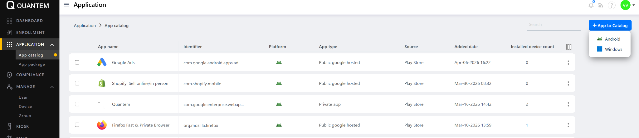 The Quantem Console allows admins to whitelist Google Play Store apps for their organization through the App Catalog. Once a Google Play app is whitelisted, it becomes available to be pushed and installed across multiple devices through Policies or Kiosk configurations — via a Google-managed iframe embedded within the Quantem Console.