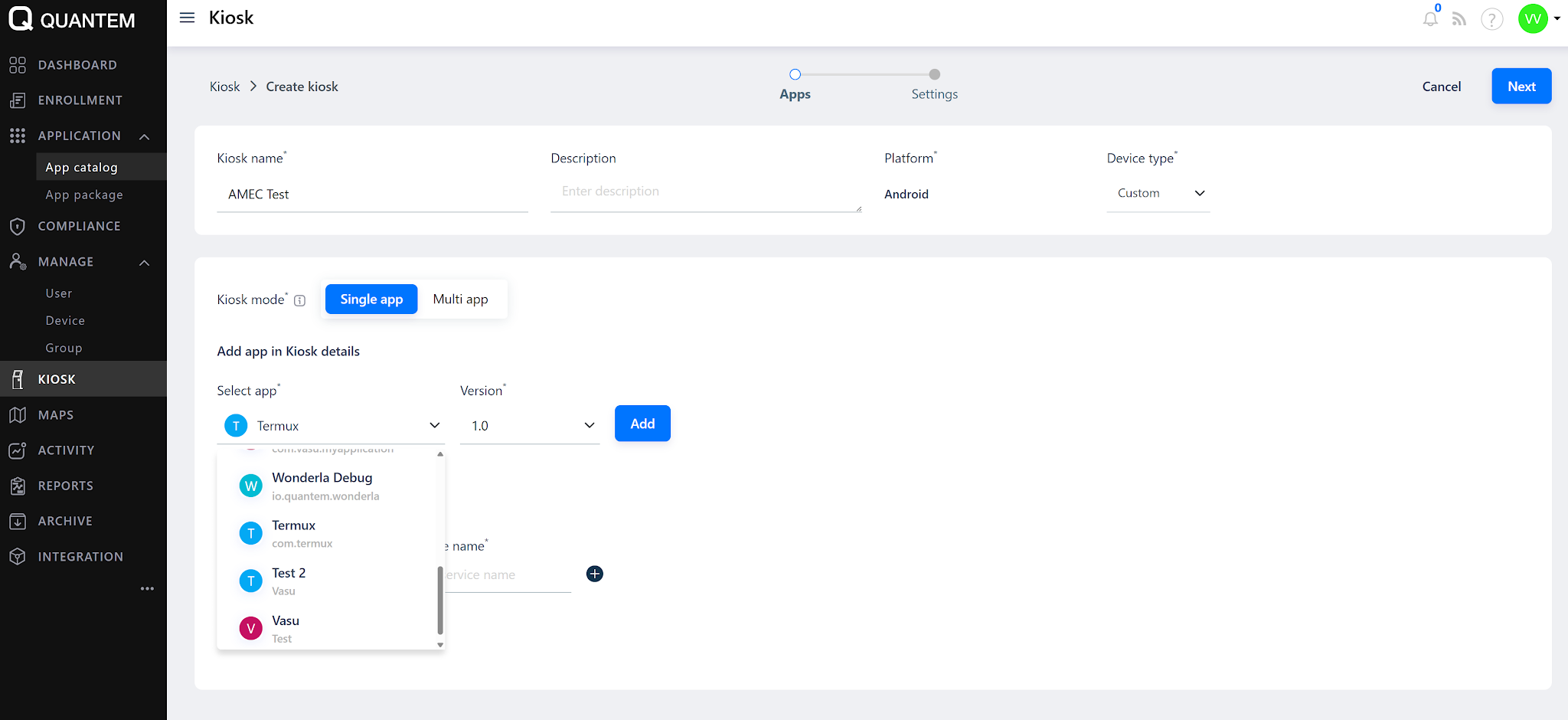 Once added, navigate to your kiosk policy or group settings. You'll find an option to add the enterprise app, which can then be assigned to devices.