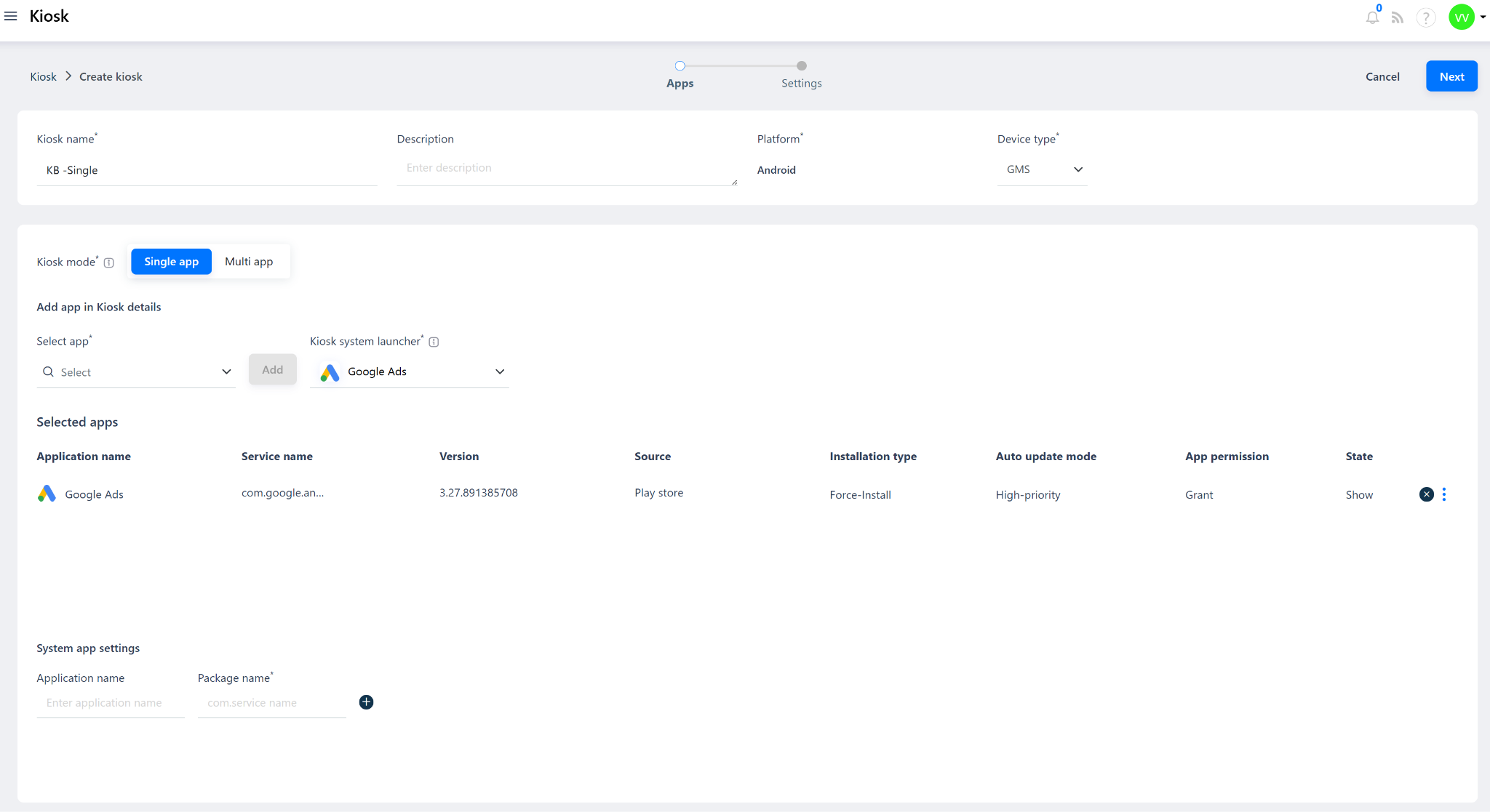 Important: The application selected as the Kiosk App and the Kiosk System Launcher must be the same application. This locks the device into that single app experience from boot.