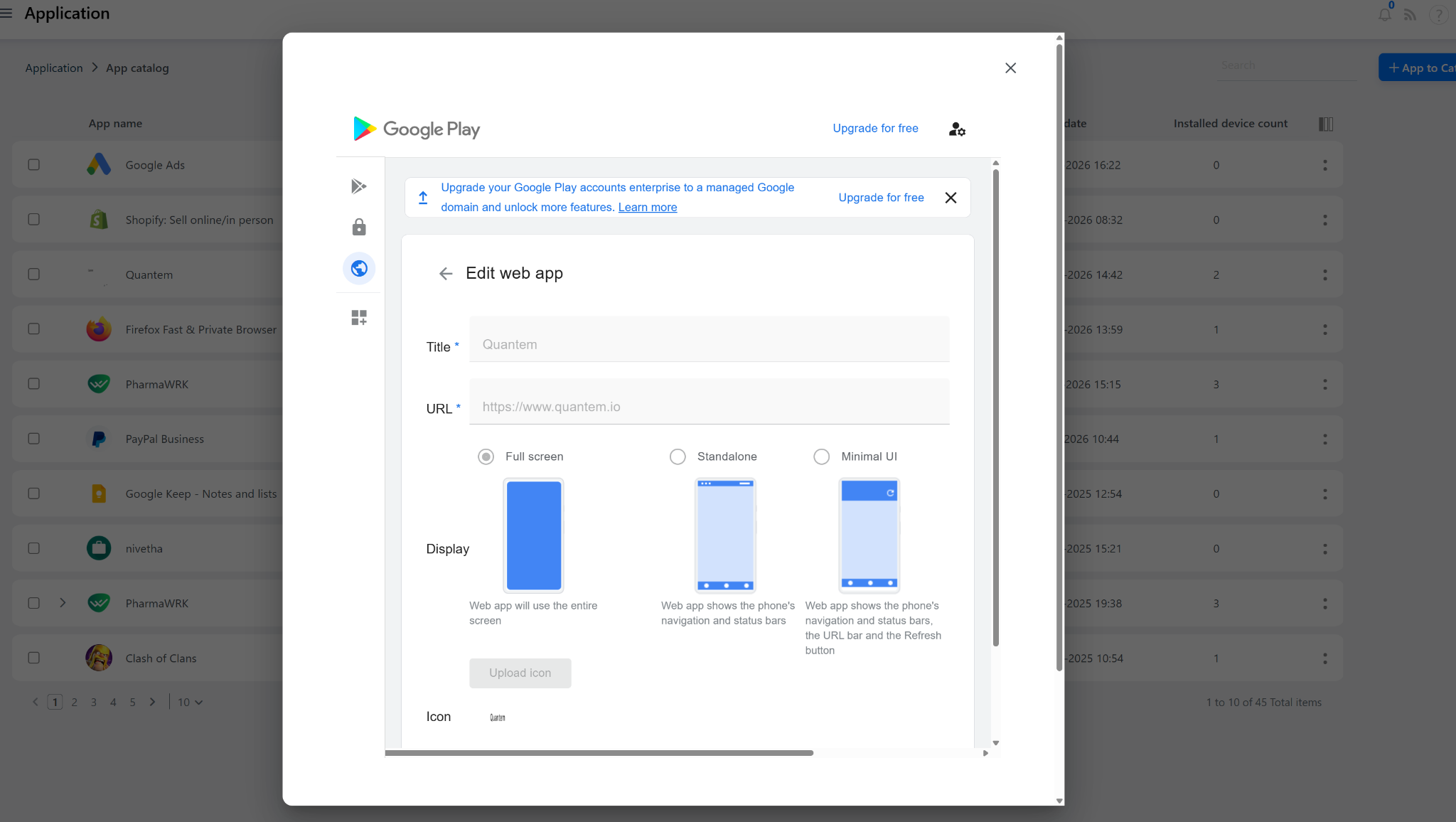 Web Kiosk Mode in the Quantem Console allows admins to lock a managed device to display and run a specific web application (URL) as the kiosk experience. A Web App in this context is essentially a website or web-based tool that behaves like a native app on the device — when the user taps the web app icon, it opens the configured URL directly. This is ideal for devices that need to display a web portal, dashboard, form, or any browser-based tool in a locked kiosk environment.