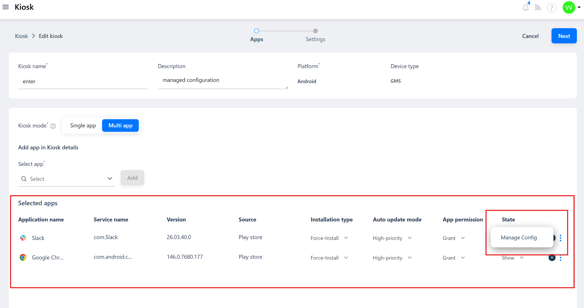 The Managed Configuration feature allows administrators to define custom settings or parameters for whitelisted apps directly within a kiosk profile. This helps tailor app behavior to meet enterprise or use-case-specific requirements on managed devices.