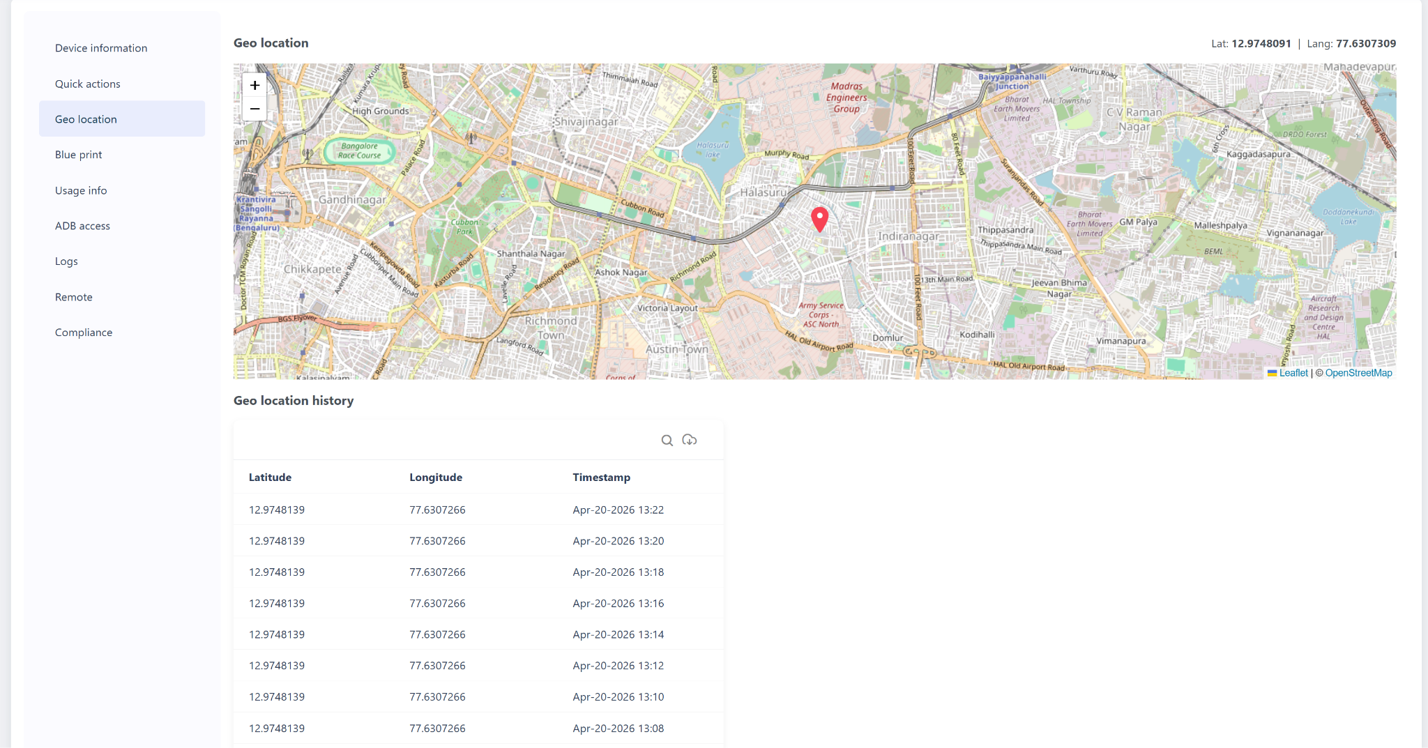 The Geo Location feature in the Quantem Console allows admins to track and view the real-time location and historical location data of enrolled devices. The device's location is captured and updated based on the Global Sync Time — ranging from every 2 minutes up to 1 hour. The location is displayed on an interactive map within the console and logged as a timestamped coordinate history, giving admins a complete trail of where the device has been.