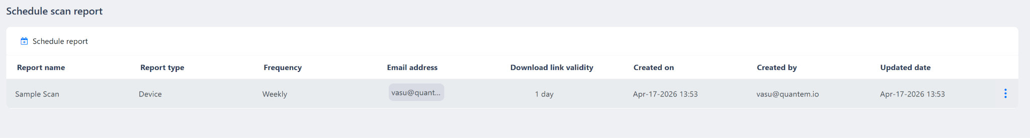 The Scheduled Reports feature in the Quantem Console allows admins to automate the generation and email delivery of device reports on a recurring basis. Instead of manually pulling reports each time, admins can configure a schedule — Daily, Weekly, or Monthly — and have the report automatically generated and delivered to one or more email recipients at a specified time.
