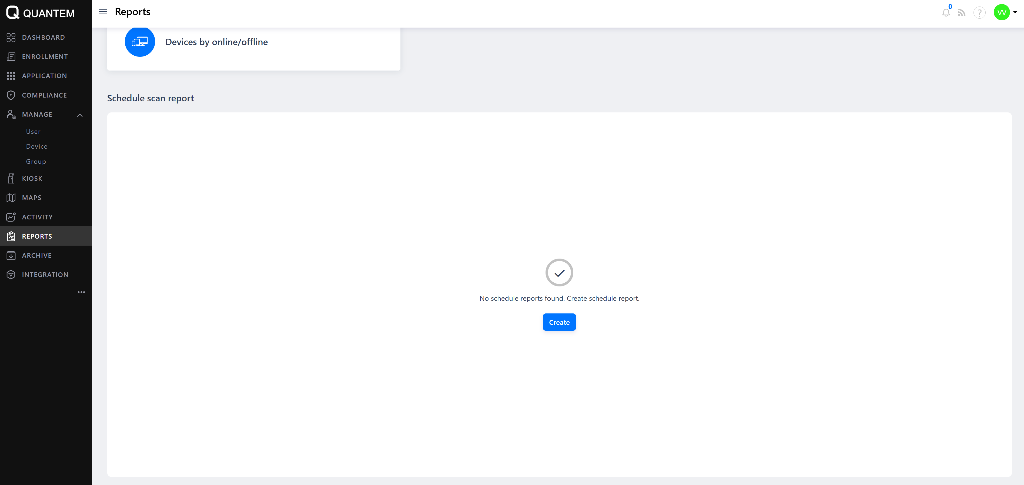 On the Reports page, scroll down to the Schedule Scan Report section. If no scheduled reports have been created yet, the message "No schedule reports found. Create schedule report." will be displayed. Click Create.
