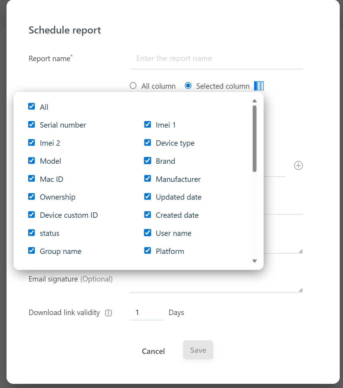 If you need to filter, bifurcate, or extract specific data points — select Selected Column and hand-pick only the columns relevant to the report's purpose. This is particularly useful when sharing reports with specific teams who only need certain device information (e.g., the operations team only needing device status and group, or the finance team needing ownership and carrier data).