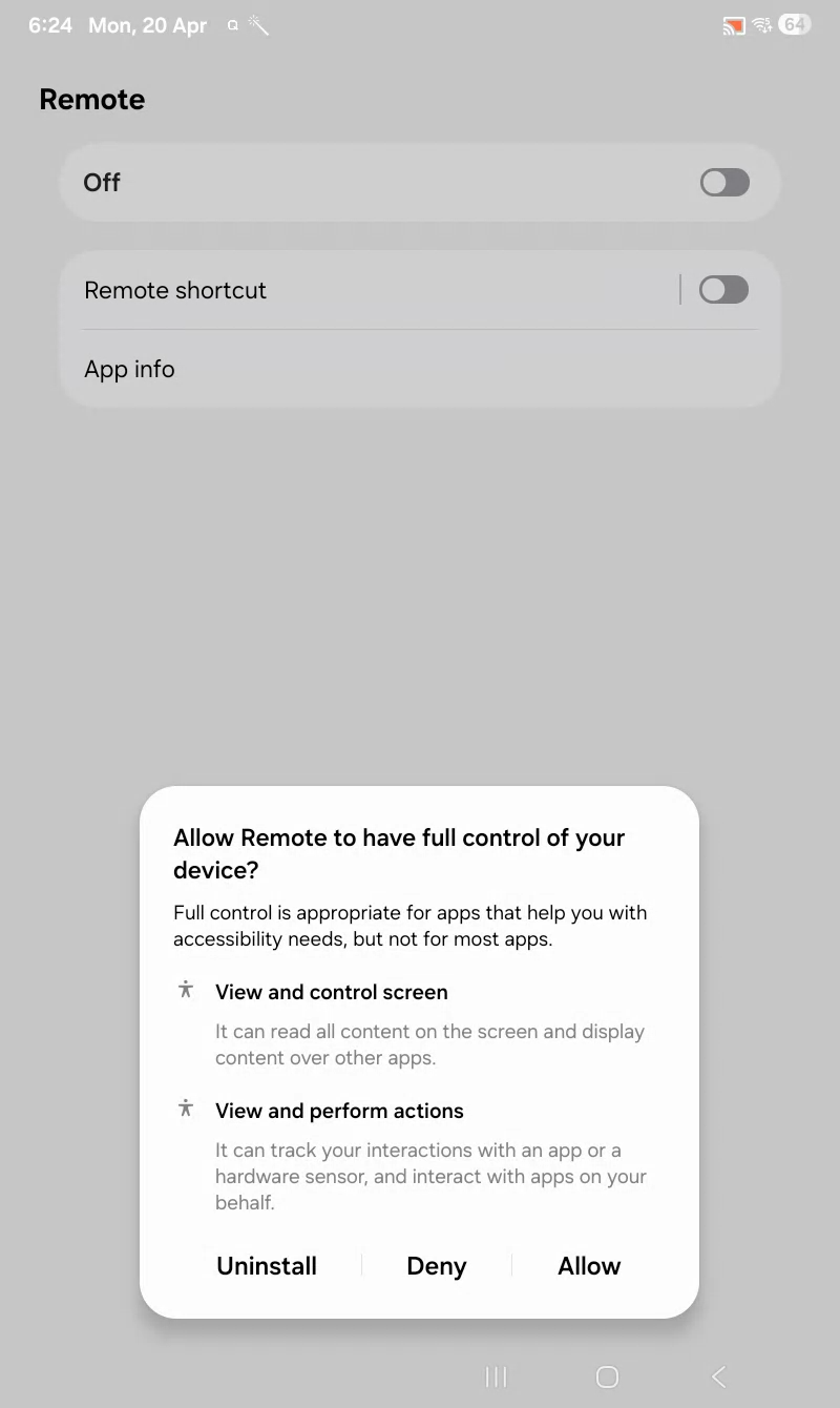 Why this works: Android's Accessibility permission allows the Quantem app to simulate user interactions (taps, swipes, navigation) — enabling full remote control without user intervention.