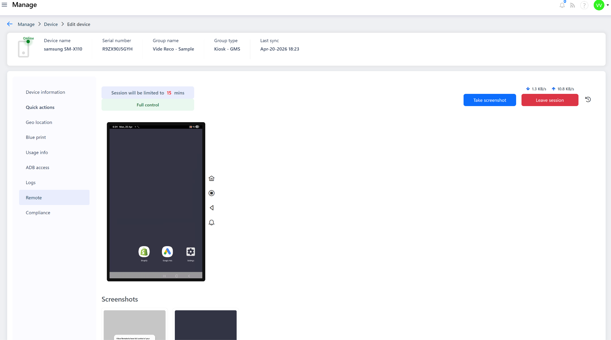 Remote Device Control in the Quantem Console allows IT admins to remotely access, view, and fully control an enrolled device directly from the web console — without needing physical access to the device. This is highly useful during device troubleshooting and remote support when the device is at a distant location but connected to the internet. Admins can interact with the device screen in real-time, navigate apps, configure settings, and capture screenshots — all from the Quantem Console.